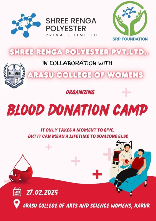 At Shree Renga Polyester Pvt. Ltd. & SRP Foundation, we believe that every drop of blood counts in saving lives. On February 27, 2025, we successfully conducted a Blood Donation Camp at Arasu College of Arts and Science for Women, in collaboration with the Government Medical College & Hospital. This initiative aimed to empower young women to take charge of social responsibility and make a meaningful impact.